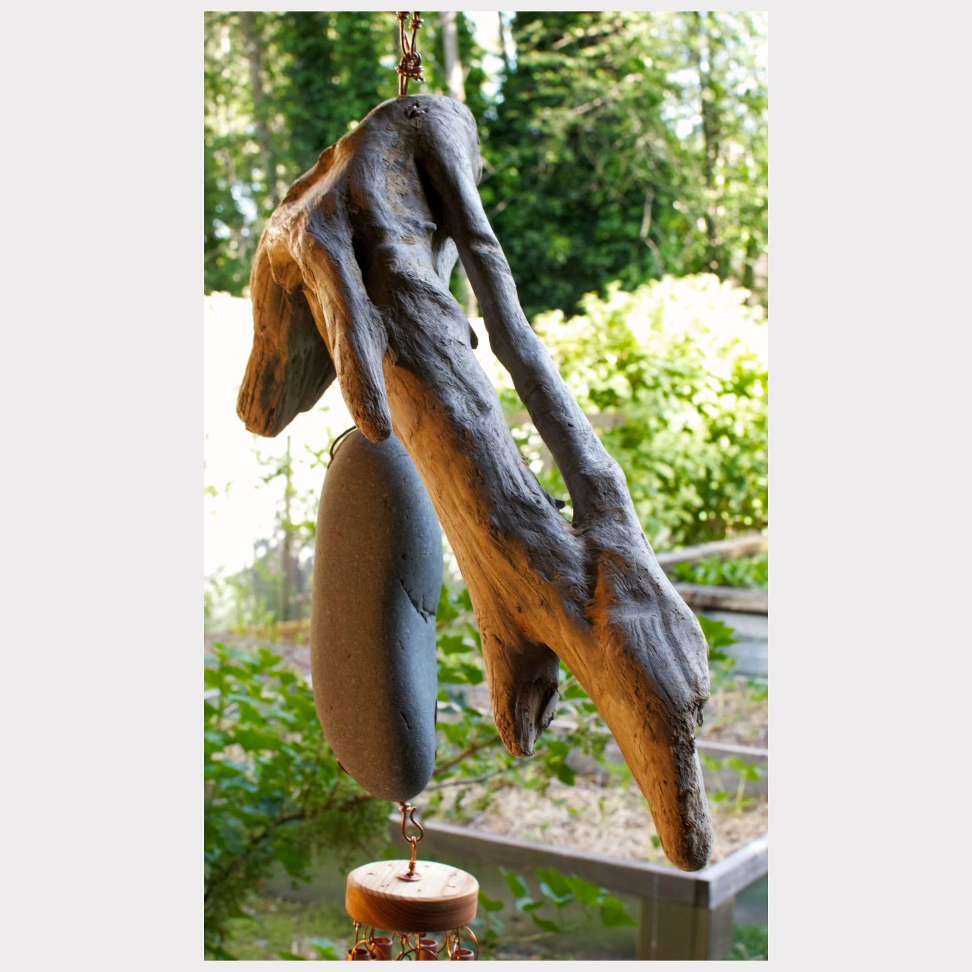 Bring the rugged West Coast Pacific Ocean home to your outdoor space with this unique handcrafted natural driftwood and beach stone wind chime. Measuring approximately 56 inches long from the top of the copper hanging loop to the bottom of the polished copper windsail and 26 inches wide, this is a very large wind chime that makes an amazing focal point for a yard, garden, deck, or porch.