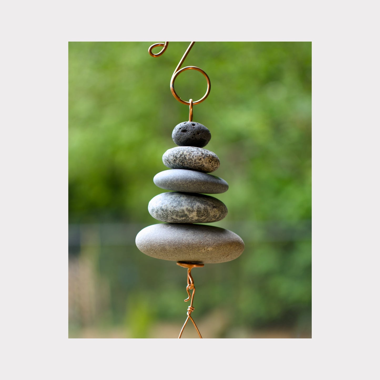 The wind chime measures approximately 28 inches in length, from the top of the copper hook to the bottom of the chimes. The natural Pacific beach stones are drilled right through and connected with heavy copper wire. This is a terrific chime for any yard, garden, deck or porch— a wonderful gift for a nature lover, or a present for anyone who appreciate handmade quality and durability.